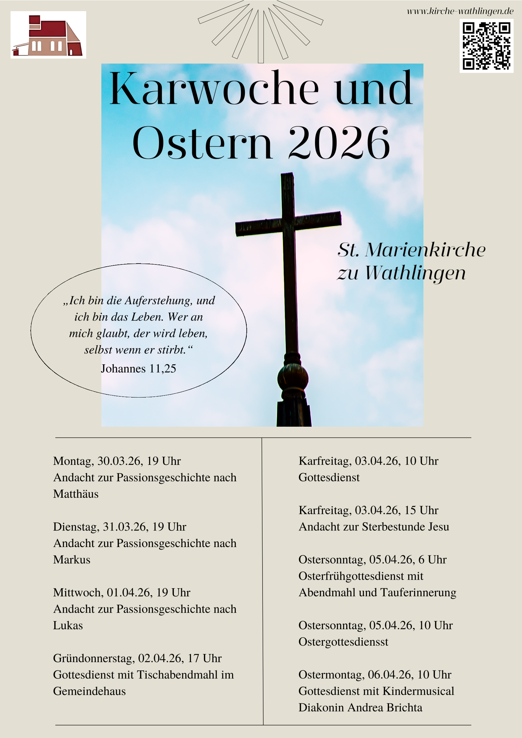Wathlingen. Die St. Marienkirche lädt herzlich zu den Gottesdiensten und Andachten in der Karwoche und an den Osterfeiertagen 2026 ein.