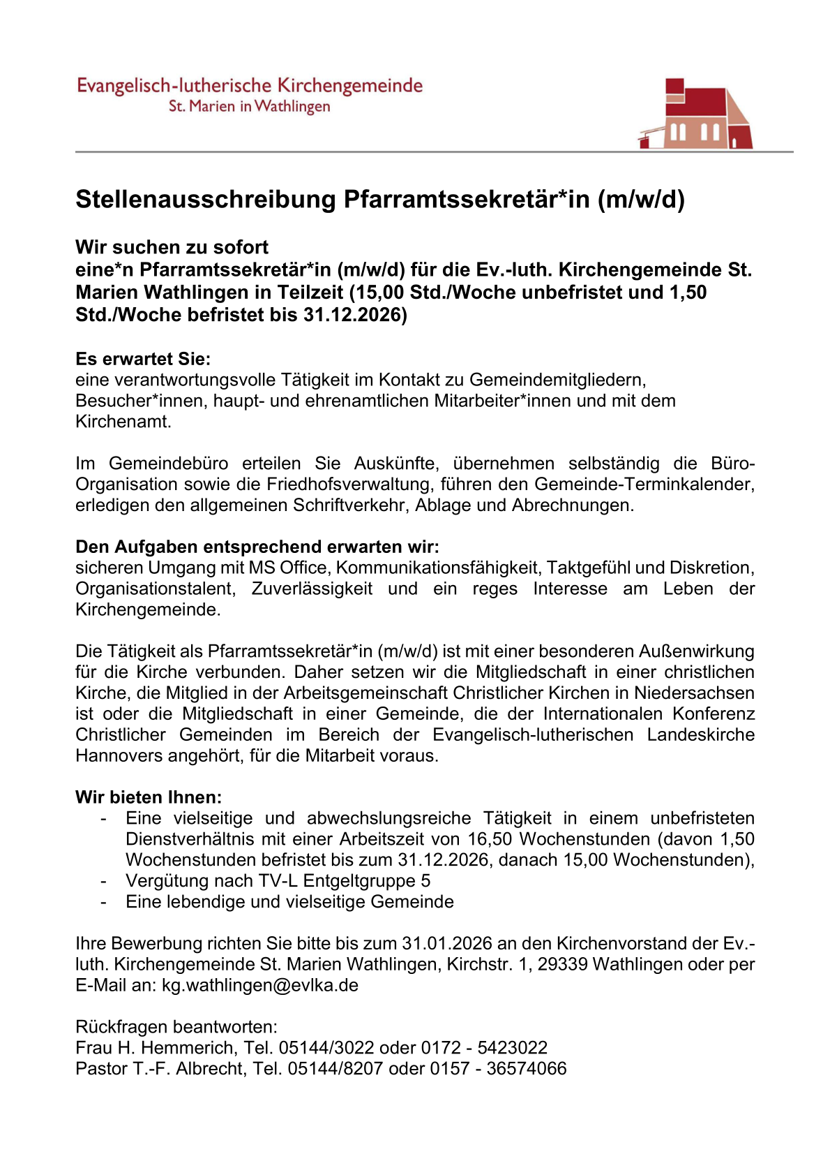 Die Ev.-luth. Kirchengemeinde St. Marien Wathlingen sucht zum nächstmöglichen Zeitpunkt eine*n Pfarramtssekretär*in (m/w/d) in Teilzeit.